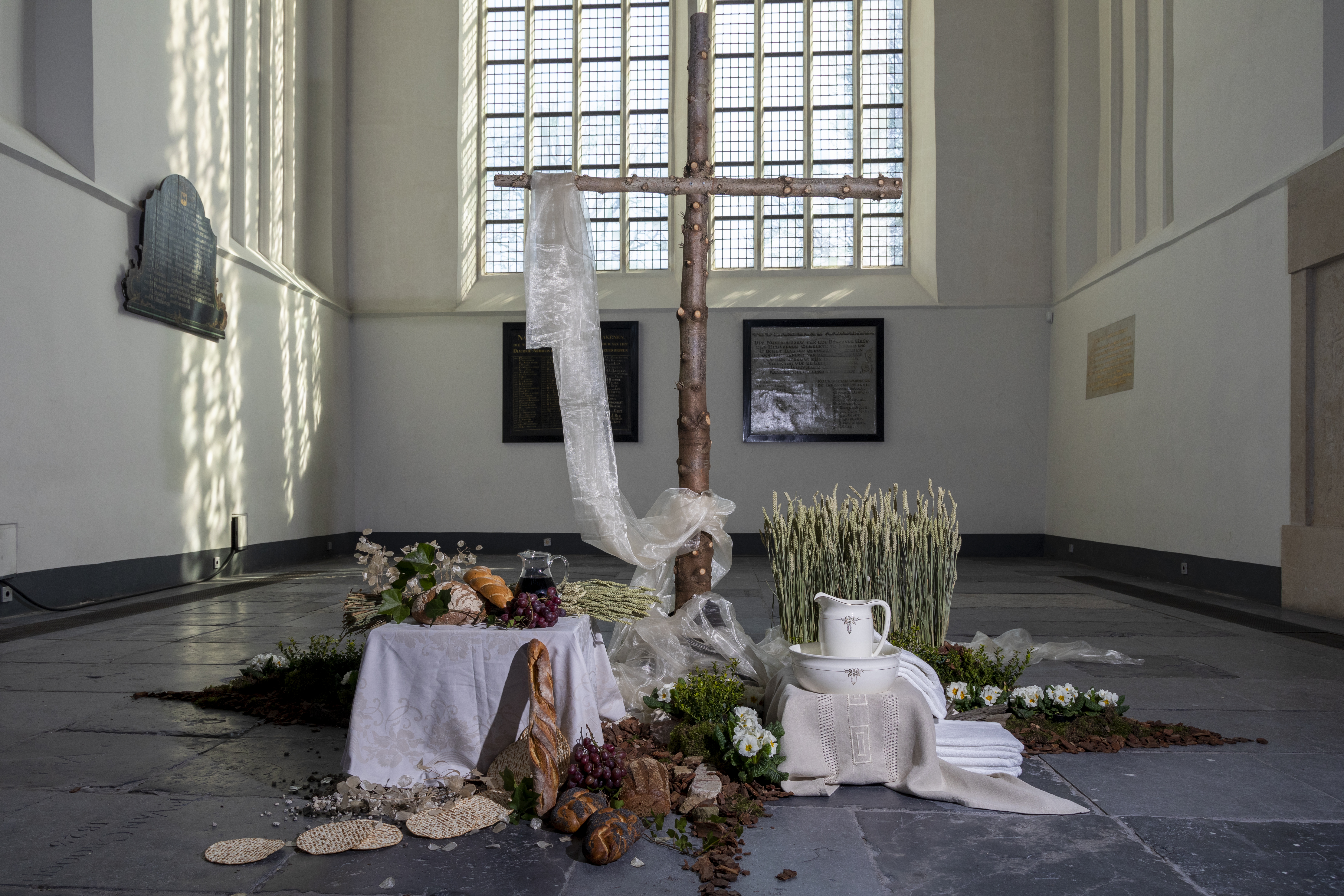 Brood en wijn – uit druiven en graan - staan voor het lichaam en bloed van Jezus. De ranken van de wintergroene klimop (Hedera), symbool van eeuwig leven, doen denken aan die van de wijnstok. De waskom met kan en handdoek, verwijzen naar de voetwassing van Jezus. De judaspenning (Lunaria annua) herinnert aan het verraad van Jezus. De aangescherpte maatregelen gericht op samenkomsten maken het nog steeds mogelijk om individueel de Grote Kerk te bezoeken voor persoonlijke bezinning, bezieling, gebed en meditatie. Ook is er gelegenheid voor het aansteken van een lichtje in de stiltekapel. Om er strikt op toe te zien dat er niet meer dan 30 personen tegelijkertijd in de kerkruimte zijn, is alleen de ingang onder de toren geopend. Bij binnenkomst worden hygiënemaatregelen in acht genomen. We spreken elkaar erop aan als de fysieke afstand van 1.5 meter niet wordt gerespecteerd. Tijdens de Stille Week is de Grote Kerk ook open op Goede Vrijdag van 19.00 – 20.00 uur en op Stille Zaterdag van 20.30 -21.30 uur. Beeldregistratie uit Protestantse Gemeente Naarden Audioregistratie uit Protestantse Gemeente Naarden |